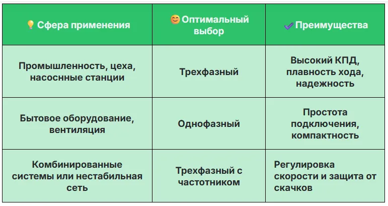 При выборе между однофазным и трёхфазным двигателем важно учитывать тип электросети, характер нагрузки, условия эксплуатации и требования к энергоэффективности.