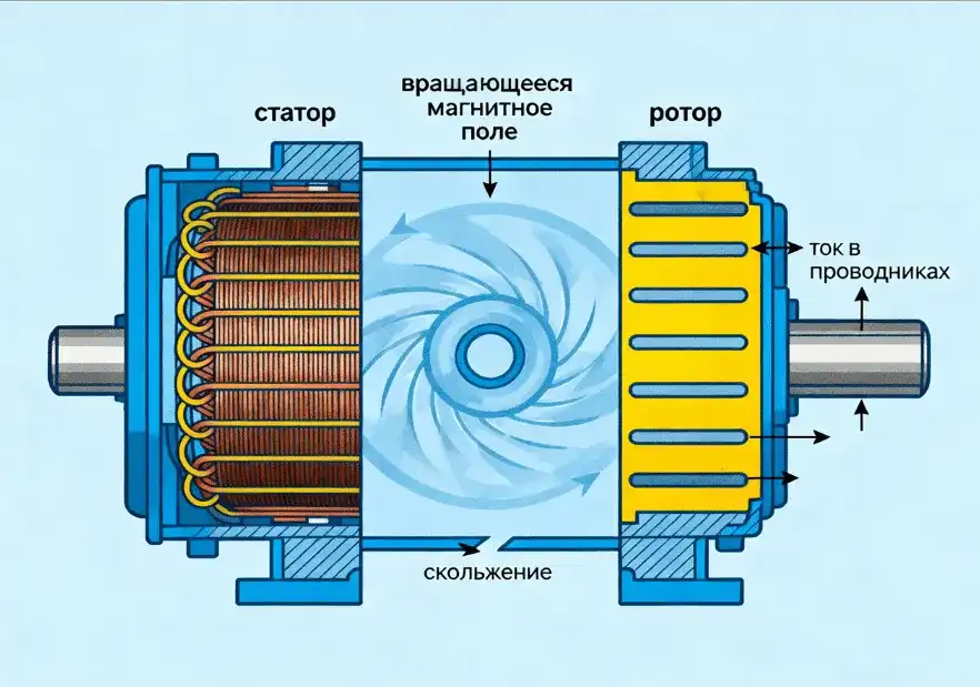 Когда на статор подаётся трёхфазное напряжение, внутри двигателя возникает вращающееся магнитное поле. Оно пересекает проводники ротора, в них рождается ток, появляются электромагнитные силы — и ротор начинает разгоняться, стремясь догнать вращающееся поле. Полной «синхронности» не происходит: небольшое отставание по скорости (скольжение) как раз и обеспечивает возникновение токов в роторе и формирование момента 🔄⚡.