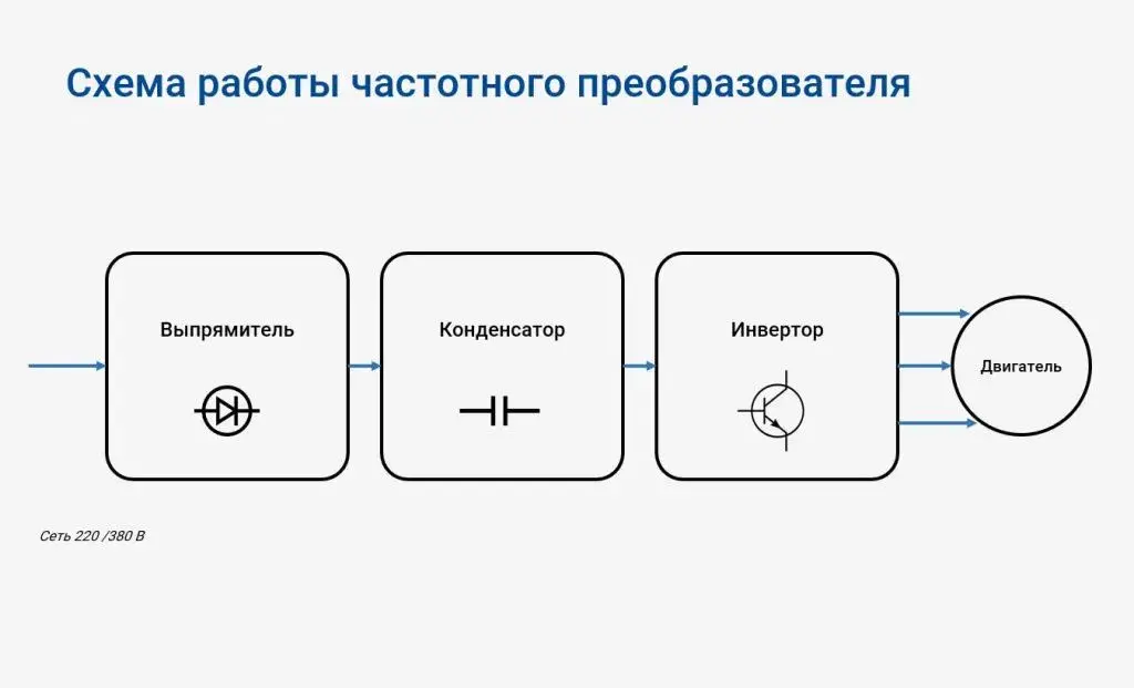 Процесс работы можно разделить на три ключевых этапа. Сначала входное переменное напряжение выпрямляется в постоянное с помощью диодного моста ( выпрямителя). Затем постоянное напряжение сглаживается электролитическими конденсаторами в звене постоянного тока. Наконец, инверторный модуль на основе мощных IGBT-транзисторов преобразует постоянное напряжение обратно в переменное, но уже с заданной частотой и амплитудой по алгоритму широтно-импульсной модуляции (ШИМ). Именно ШИМ позволяет формировать синусоидальный сигнал для двигателя, минимизируя вредные гармоники и нагрев.
